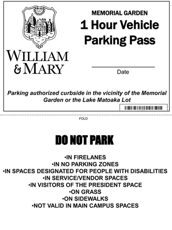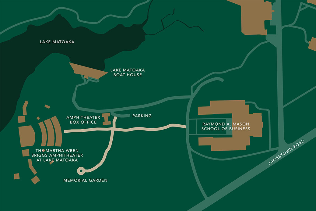 Take I-64 West toward Williamsburg/Richmond. Take Exit 242A (for VA-199) toward Jamestown/Williamsburg. Continue about 5.5 miles. Turn right on Jamestown Road, Route 31 for one mile. Turn left (on an unnamed drive directly behind the Raymond A. Mason School of Business. Turn left at the third entrance into the Matoaka Woods. Take your first left into a small parking lot. You and your guests may pull along the street side of the parking area; Unless there is an event taking place at the Briggs Amphitheatre, you may park in the parking spots labeled handicapped. Walk in front of the brick buildings and you will see a wooden Memorial Garden sign and walkway that will lead you to the garden.